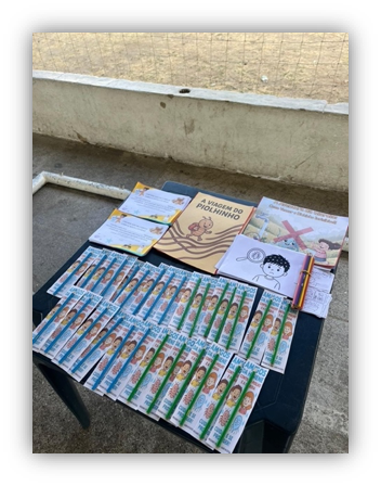 • Caminhada da Prevenção: utilizando um caminho de EVA, as crianças pintaram figuras relacionadas às práticas preventivas e posicionaram-nas ao longo da trilha, reforçando visual e simbolicamente os cuidados necessários no cotidiano.