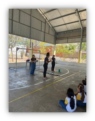 A metodologia adotada foi estruturada em formato de oficina lúdica, especialmente planejada para estudantes do 1º ano do Ensino Fundamental, garantindo linguagem acessível e atividades que estimulassem o interesse e a participação ativa das crianças. A ação teve início com um momento de acolhida e conversa guiada, utilizando imagens ilustrativas dos parasitas (piolho e giárdia) e uma breve historinha educativa, facilitando a compreensão sobre a importância da higiene pessoal e do consumo de água limpa.