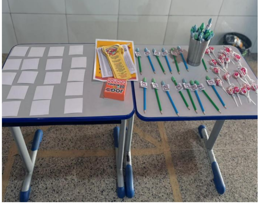 A metodologia desenvolvida pelos estudantes foi estruturada em etapas dinâmicas e adequadas ao público infantil. O momento inicial compreendeu uma acolhida em roda de conversa, criando vínculo com as crianças e introduzindo o tema por meio de figuras ilustrativas do mosquito, água parada, caixa d’água, pneus e plantas, facilitando a identificação dos principais focos de proliferação.
