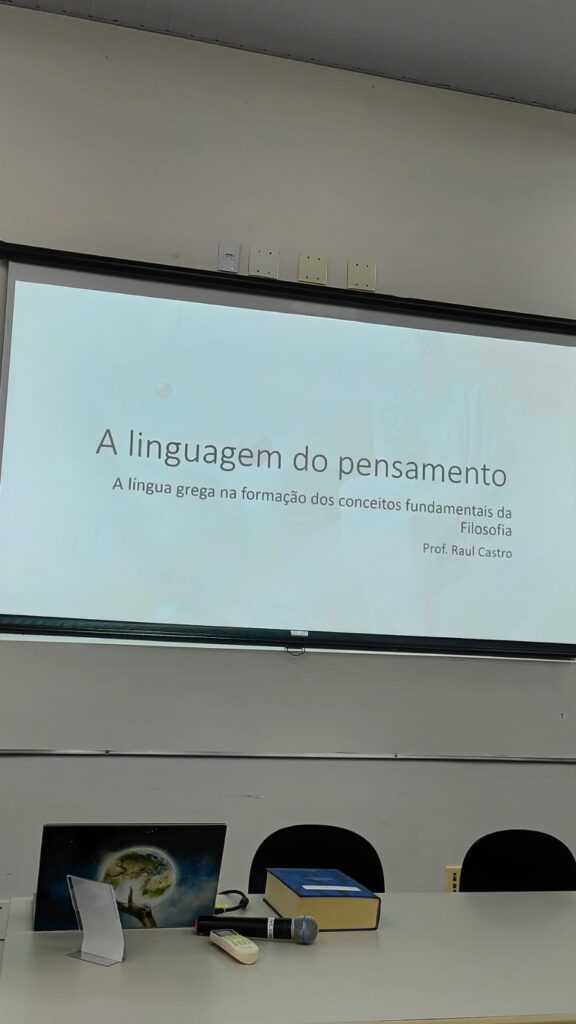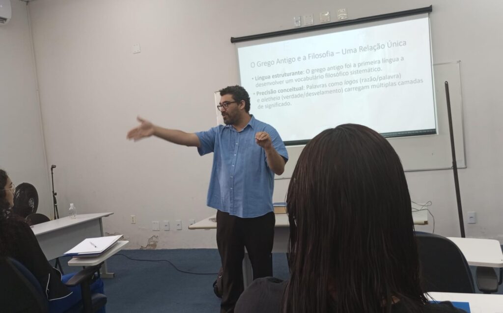 Durante o minicurso, foram debatidos temas fundamentais sobre como a língua grega contribuiu para a formulação de conceitos abstratos que marcaram a história do pensamento ocidental. O professor destacou, por exemplo, como o grego antigo possibilitou a transição de termos concretos para noções abstratas — ilustrando como a ideia do “justo” evoluiu para o conceito de justiça.