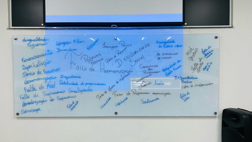 A disciplina estimulou a criatividade dos alunos através da construção de uma nuvem de palavras, sintetizando os principais desafios do Sistema Único de Saúde (SUS).