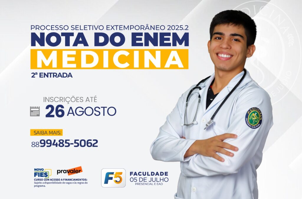 A Faculdade 05 de Julho – F5 anuncia o processo seletivo para o curso de Medicina, com ingresso pelo aproveitamento da nota do ExaA Faculdade 05 de Julho – F5 anuncia o processo seletivo para o curso de Medicina, com ingresso pelo aproveitamento da nota do Exame Nacional do Ensino Médio (ENEM). Esta é uma oportunidade única para quem deseja cursar Medicina em uma instituição reconhecida pela excelência acadêmica, a partir do semestre letivo 2025.2, cujas aulas tiveram início em 18 de agosto de 2025.