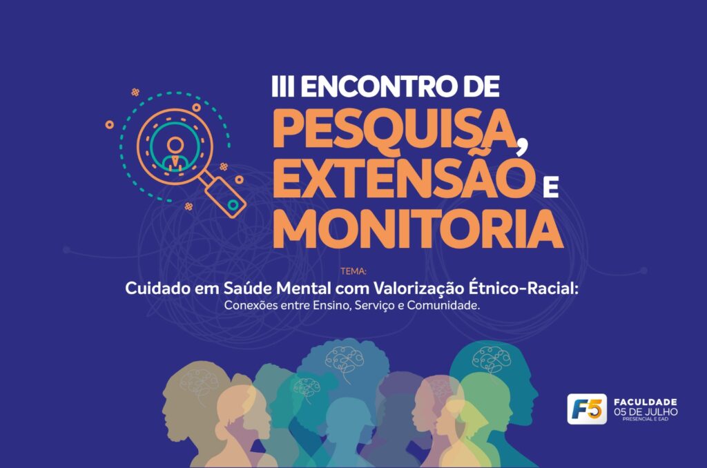 A Faculdade 05 de Julho (F5) anuncia a abertura das inscrições para submissão de trabalhos científicos no III Encontro de Pesquisa, Extensão e Monitoria, que será realizado nos dias 30 de setembro, 1º e 2 de outubro de 2025. O evento, organizado pela Coordenação Institucional de Pesquisa da F5, em parceria com o Programa de Educação pelo Trabalho para a Saúde (PET SAÚDE-F5), tem como tema central: “Cuidado em Saúde Mental com Valorização Étnico-Racial: Conexões entre Ensino, Serviço e Comunidade”.