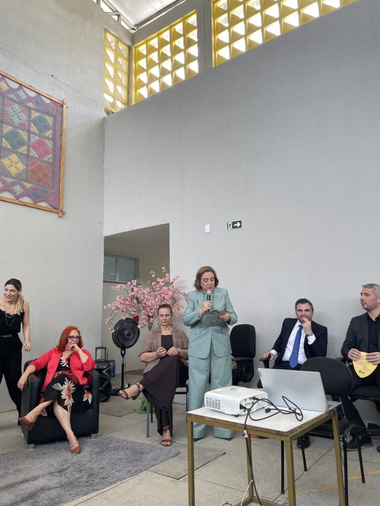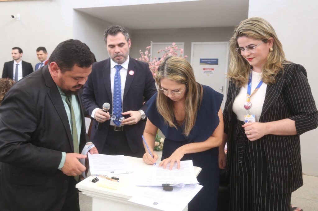 Durante o momento solene, a Prof°a Ma. Francisca Lopes assinou um termo de cooperação institucional, formalizando o compromisso da Faculdade 05 de Julho com as demais entidades parceiras na construção e fortalecimento da rede de proteção às mulheres vítimas de violência.