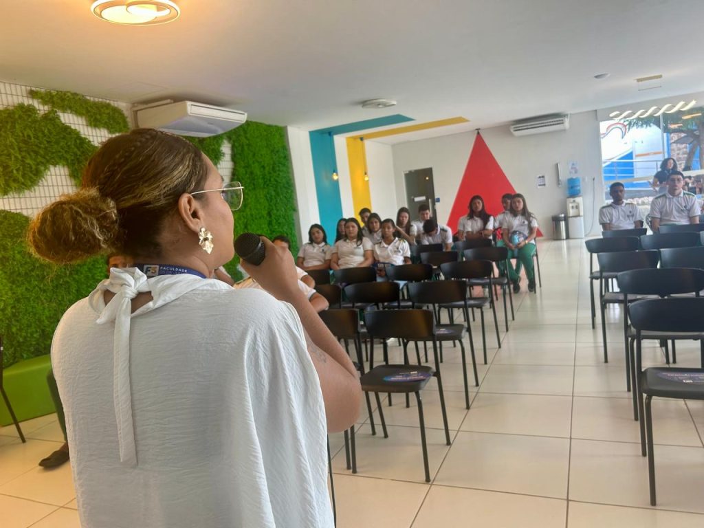 Durante a programação, os estudantes participaram de um momento formativo conduzido pela Coordenadora de Relações Institucionais da F5, Profa. Ma. Rafaele Aragão dos Santos. Na ocasião, foram acolhidos pela coordenação do curso de Odontologia, que apresentou a área de formação e suas oportunidades profissionais.