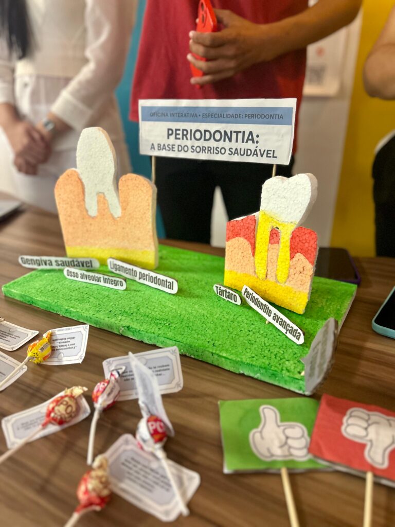 Em seguida, às 19h00, ocorreu a Roda de Conversa Temática “Cuidar é Incluir”, que abordou o atendimento a pacientes com necessidades especiais. O diálogo foi conduzido pela Profª Me. Kemylle Mesquita Brito (Psicóloga) e pela Profª Me. Hélvia Diógenes (Cirurgiã-Dentista), proporcionando aos participantes reflexões sobre acolhimento, acessibilidade e práticas inclusivas. O primeiro dia encerrou-se com a apresentação de trabalhos científicos em formato de banners digitais, síncronos e assíncronos, que possibilitaram ampla participação discente.