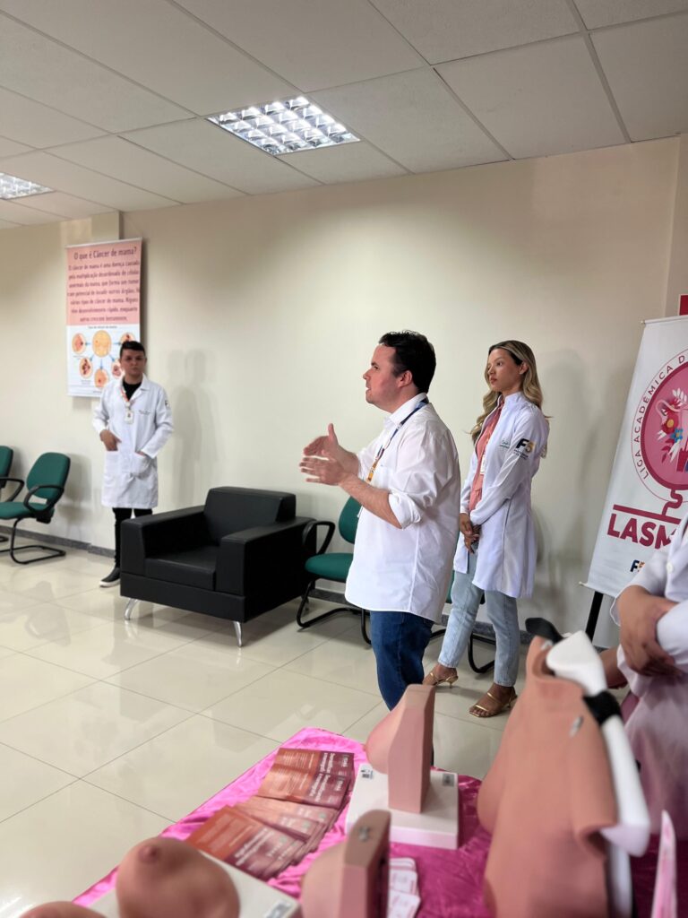 O momento foi conduzido pelo Prof. Me. Bruno Frota e contou com a participação ativa dos ligantes da LASM, que compartilharam orientações sobre autocuidado, rastreamento precoce e hábitos de vida saudáveis. Durante a ação, foram discutidos temas como a importância do diagnóstico precoce, o acesso aos serviços de saúde e o papel do conhecimento como ferramenta de empoderamento feminino.