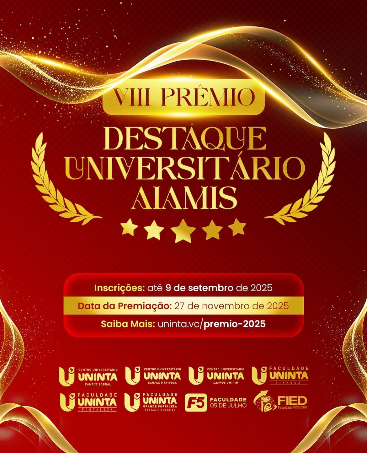 A Faculdade 05 de Julho (F5), por meio da Coordenação Institucional e da Gestão de Pesquisa, anunciou oficialmente nesta semana a abertura das inscrições para o Prêmio Destaque Universitário 2025. A divulgação aconteceu nas unidades Sede e Campus Centro, reforçando o incentivo da instituição à valorização da produção acadêmica. O prêmio é uma iniciativa da Associação Igreja Adventista Missionária (AIAMIS) e contempla alunos e seus professores-orientadores dos cursos de graduação (presenciais e EaD) e pós-graduação (Lato e Stricto Sensu) das instituições mantidas pela associação, incluindo: Reconhecimento do Mérito Acadêmico: O Prêmio Destaque Universitário tem como principal objetivo reconhecer e valorizar o mérito acadêmico nas áreas de pesquisa, extensão/inovação e técnico-cultural. A premiação visa ainda estimular a participação ativa dos estudantes
